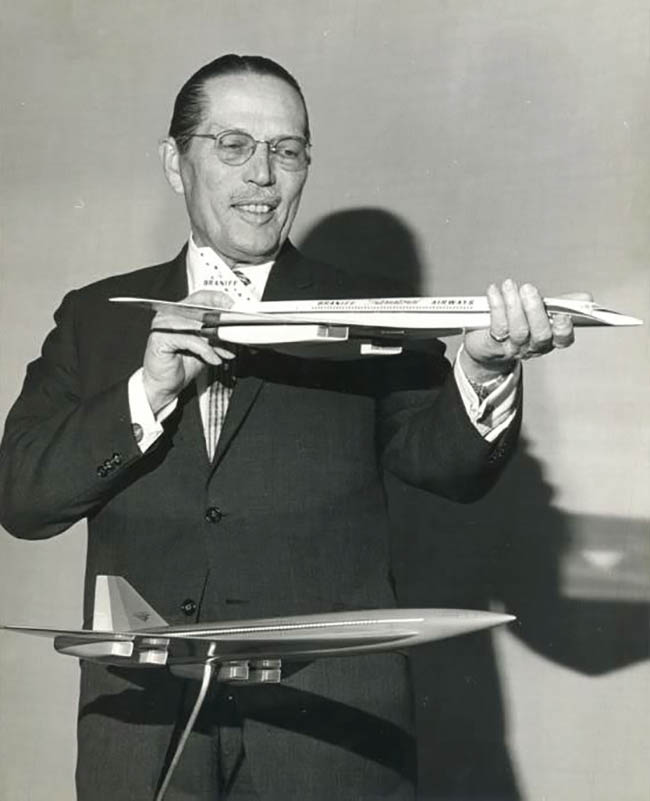 Braniff International Airways President Charles Edmund Beard admiring the models of the US Supersonic Transport Aircraft, the Boeing 2707.
