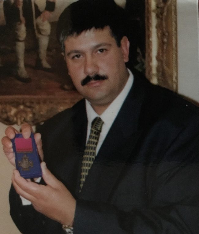 Dilip Sarkar with the actual VC of Harry Nicholls, Wellington Barracks, 1999. Image source: Dilip Sarkar Archive.