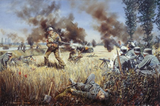 Once the enemy guns were out of action we fired on Germans crossing the river. We sank two boats, then Harry turned the Bren on Germans both sides of the river. By then we were drawing a lot of small arms fire ourselves’.