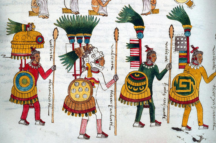 Four Aztec warriors wielding topoztopilli (spears). Image from the Codex Mendoza.