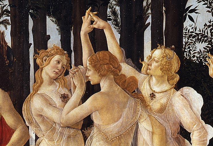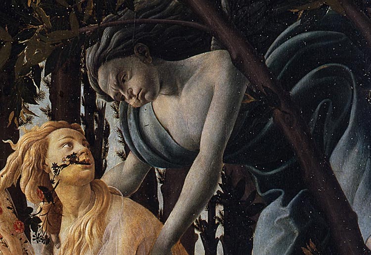 But how to make sense of this bizarre assembly of figures? It continues to puzzle art historians to this day, ensuring a constant stream of lively debate and new theories. Botticelli has used a number of sources here. Some inspiration must have come from Ovid, who wrote about Chloris and her transformation. Perhaps he looked to the work of Lucretius, who in his poem De rerum natura conjures the imagery seen here in Primavera. Or was this a nod to Rusticus, a poem celebrating country life by Poliziano, a close friend of the Medici family?