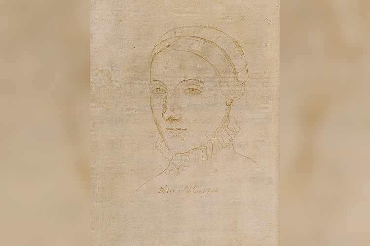 The only surviving image that may depict Anne Hathaway, wife of William Shakespeare. Portrait line-drawing made by Sir Nathaniel Curzon in 1708, referred to as “Shakespear’s Consort”. It was drawn on the verso of the original title page in the Third Folio (1663) of Shakespeare’s works located in the Colgate University Libraries, Special Collection and University Archives, Hamilton, NY.