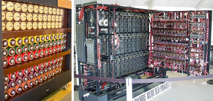 A complete and working replica of a bombe now at The National Museum of Computing on Bletchley Park. Left: front (Image Credit: Antoine Taveneaux / CC); Right: back (Image Credit: Maksim / CC).