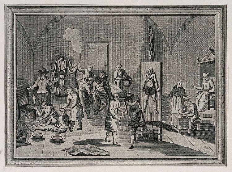 Etching of the inside of a jail of the Spanish Inquisition, with a priest supervising his scribe while men and women are suspended from pulleys, tortured on the rack or burnt with torches. (Image Credit: Wellcome Images, Photo number: V0041650 / CC).