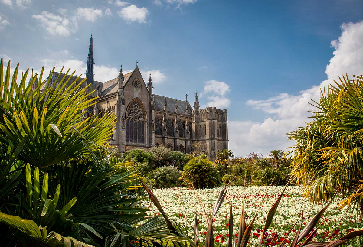 Arundel Castle during the Tulip Festival with Arundel Cathedral on the background