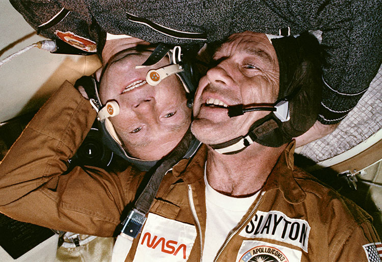 Leonov (left) with Deke Slayton in the Soyuz spacecraft. Image credit: NASA, Public domain, via Wikimedia Commons