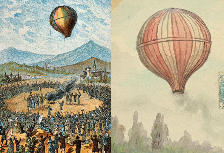 First public demonstration in Annonay, 4 June 1783 (left); First Montgolfier brothers balloon, 1783 (right)