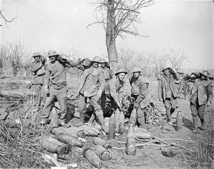 Battle of St. Quentin. Gunners of the 299th Siege Battery, Royal Garrison Artillery carrying 6-inch howitzer shells to the battery. Avesnes, 23 March 1918.