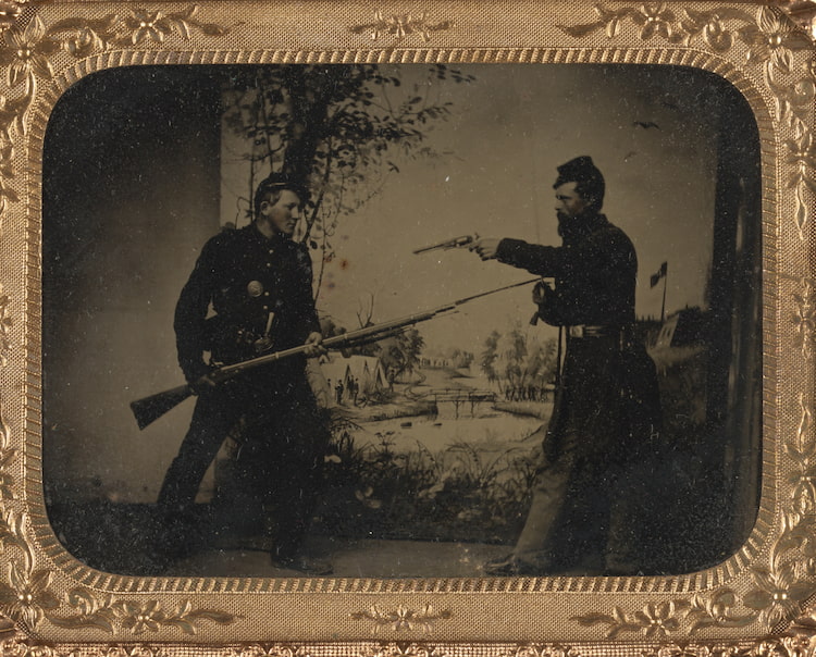 Two unidentified soldiers in Union uniforms posing with bayoneted Springfield Model 1861 rifled musket with attached bayonet, knife, and Colt Model 1851 Navy revolver