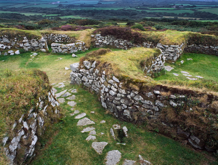 Chysauster Ancient Village in Cornwall contains the ruins of a late Iron Age and Romano-British settlement, now operated by English Heritage. Today it provides a fascinating look into ancient Britain, with fantastic views of the surrounding area.