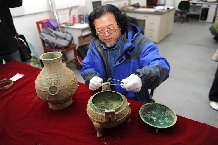 An archaeologist with an animal bone soup that dates back some 2,400 years. The bygone-era broth was found by Liu Daiyun, of the Shaanxi Provincial Institute of Archaeology, in Xi’an, Shaanxi Province, China.