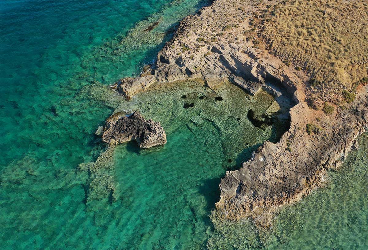 Aerial view of the walls of the sunken ancient city of Olous in Elounda, Crete