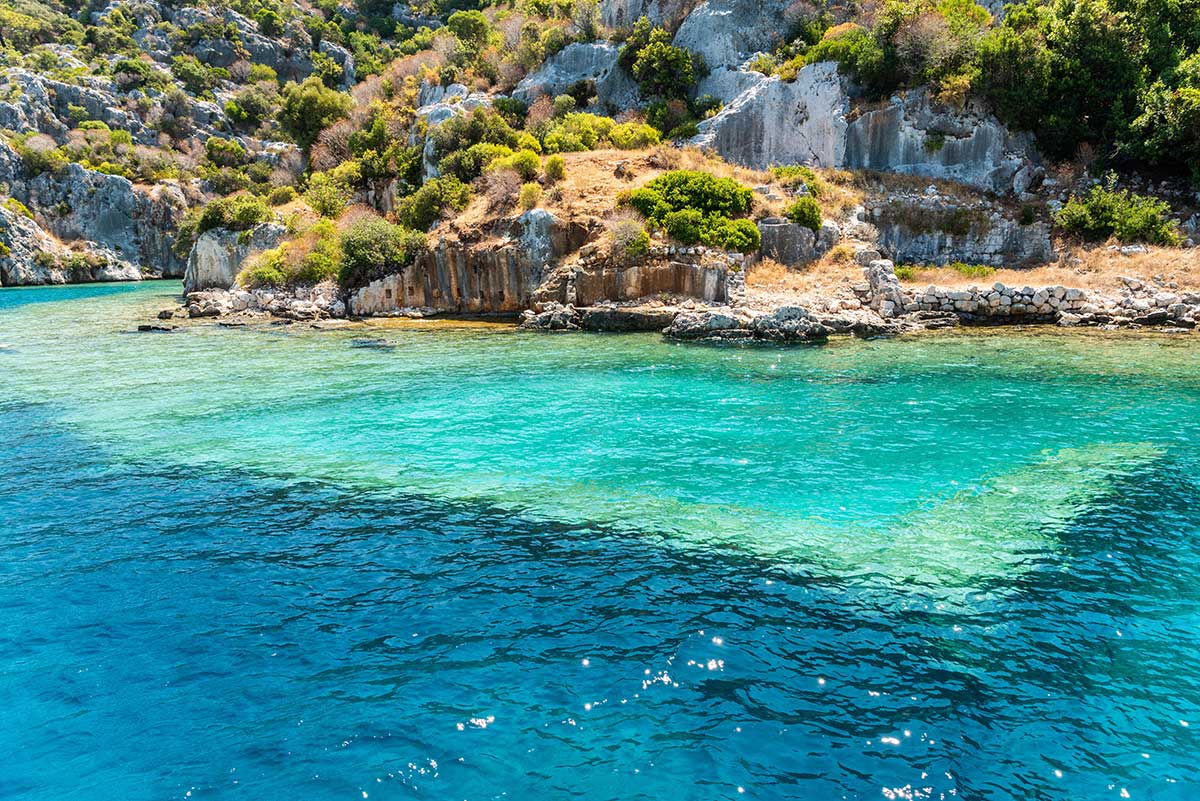 Coast of Kekova island with visible underwater structures of the partially sunken city of Dolchiste
