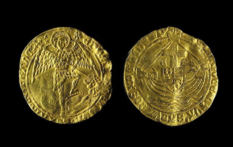 The coin’s obverse features a representation of the archangel St Michael slaying the devil, while the reverse depicts a ship surmounted by a shield bearing the king’s arms. The coin also has the inscription, PER CRUCEM TUAM SALVA NOS CHRISTE REDEMPTOR (‘by thy cross save us, Christ Redeemer’).