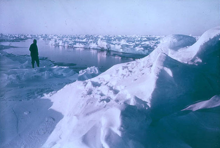 Sir Ernest Shackleton watching a lead forming, 1915. Photographed by Frank Hurley.
