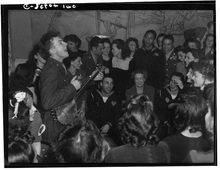 Washington, D.C. Pete Seeger, noted folk singer entertaining at the opening of the Washington labor canteen, sponsored by the United Federal Labor Canteen, sponsored by the Federal Workers of American, Congress of Industrial Organizations (CIO).