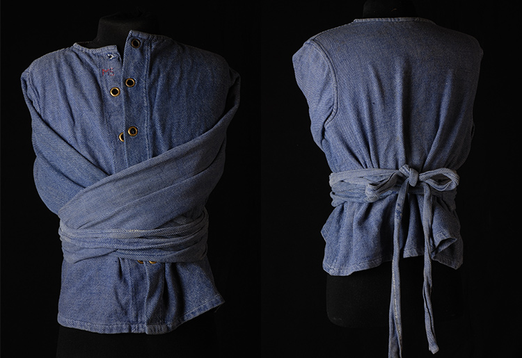 Made of thick material, bound by laces and extending overlong arms around the back, the straitjacket is emblematic of a period of care for people with mental health conditions which often boiled down to harsh confinement and social alienation.