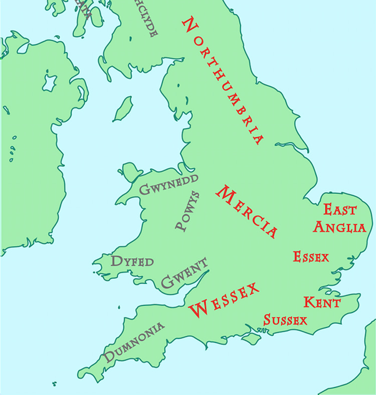 Map showing the Anglo Saxon heptarchy, including the kingdoms of Northumbria, Mercia, Wessex and East Anglia.