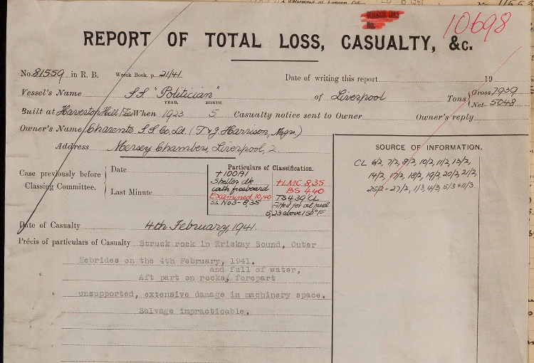 This is where the real story begins. SS Politician left Liverpool Docks in February 1941 where she was to travel to the far north of Scotland and join other vessels that would be convoyed across the Atlantic. Under the master Beaconsfield Worthington and a crew of 51, she was conveying a mixed cargo of cotton, biscuits, sweets, bicycles, cigarettes, pineapple chunks, and Jamaican banknotes to the value of around £3 million.