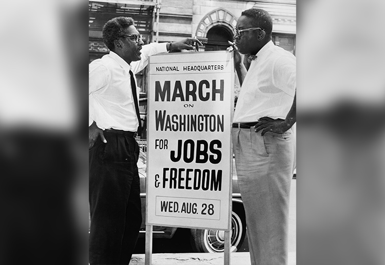 In 1941, Rustin was one of the main organisers of the March on Washington Movement, which advocated for an end to racial discrimination in employment. As well as organising labour union president and socialist A. Philip Randolph, the march leader, he influenced young activists to take part, drilled off-duty police officers as marshals, instructed bus captains to redirect traffic and scheduled the podium speakers. On 6 September 1963, a photograph of Rustin and Randolph appeared on the cover of Life magazine, which identified them as the ‘leaders’ of the march.