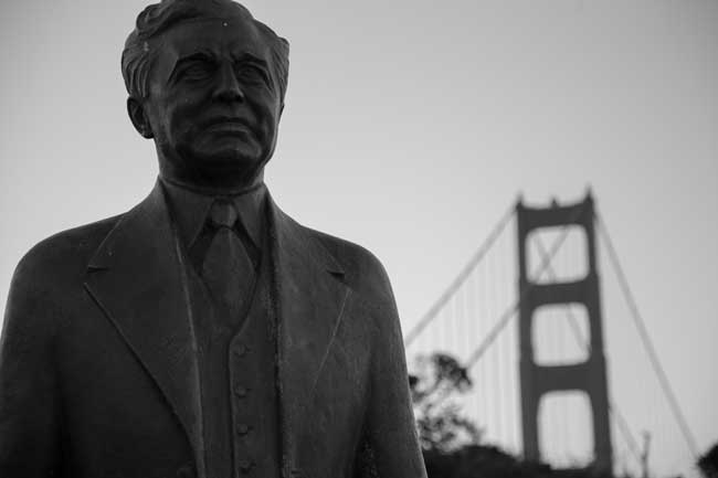 Statue of Joseph Strauss in front of the Golden Gate Bridge.