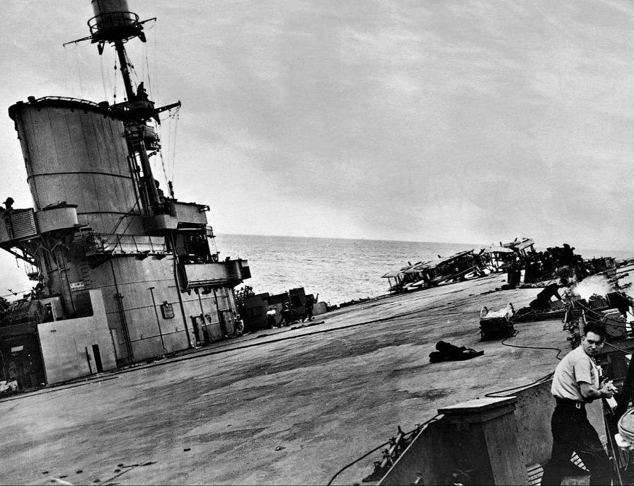 The torpedo ripped a large hole in her hull. The explosion knocked out the main switchboard, severing communications throughout the ship, and she began taking on water on the starboard side. Within 20 minutes she was listing to starboard at an angle of 18°.