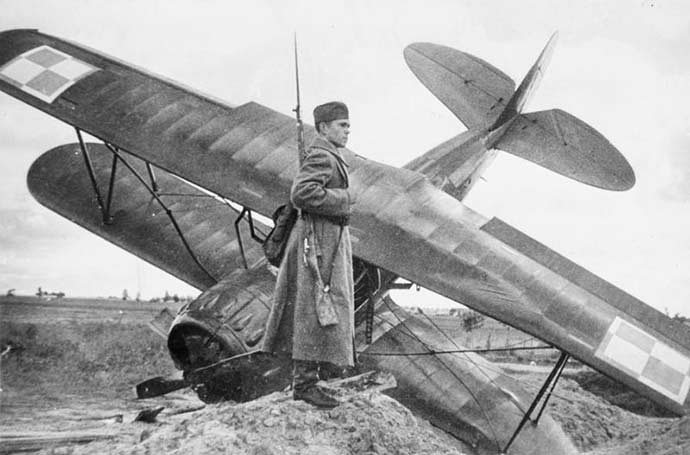 Red Army soldier guarding a Polish PWS-26 trainer aircraft shot down near the city of Równe (Rivne) in the Soviet occupied part of Poland. Credit: Imperial War Museum / Commons.