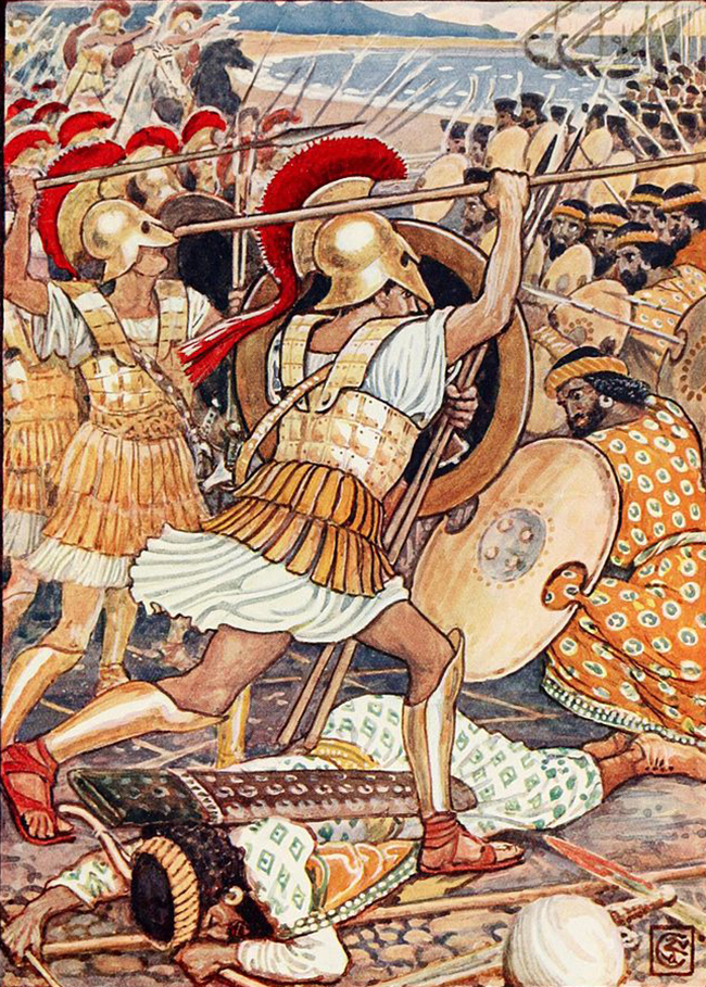 ‘They crashed into the Persian army with tremendous force’, illustration by Walter Crane in Mary Macgregor, ‘The Story of Greece Told to Boys and Girls’. Image credit: Walter Crane, Public domain, via Wikimedia Commons