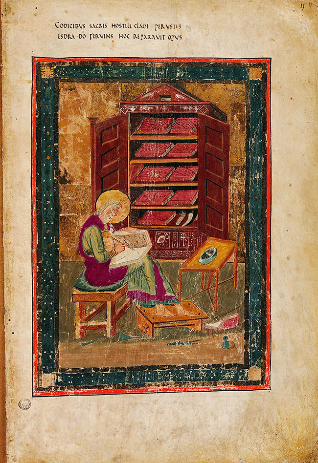 In numerous surviving gospel books are richly-decorated illustrations, created with painstaking detail. The Codex Amiatinus for instance, a giant 8th century Latin Bible, includes an elaborate, full-page illumination depicting the Old Testament prophet Ezra writing in front of a cupboard full of books. The illumination is coloured with various paints including purple, a colour associated with the elites since Roman times.