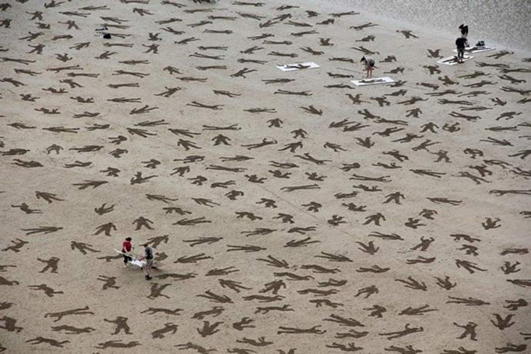 Watch NowArmed with rakes and stencils and helped by 60 volunteers, the artists etched 9,000 human silhouettes on the beaches of Arromanches to represent the civilians, Allied forces and Germans who were killed on D-Day.