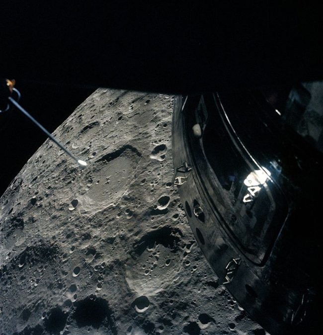 The crew of Apollo 13 photographed the Moon from their Lunar Module “life boat” as they passed by it. The shut-down Command Module is visible out the overhead rendezvous window.