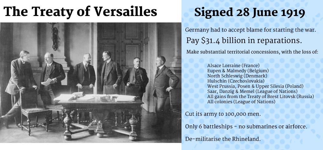 This was heavily weighted against Germany; the new government had to accept guilt for starting the war, pay substantial reparations and lose sovereignty of large amounts of territory and colonies.