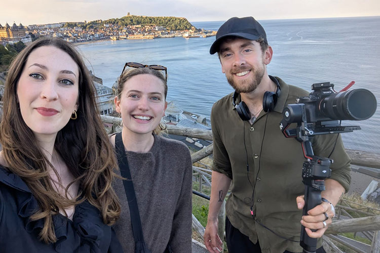 Presenter Dr Madeleine Pelling (left) with Director & Producer Laura McMillen (centre) and Shooting Assistant Producer, Shane Smith (right) – on location in Scarborough.
