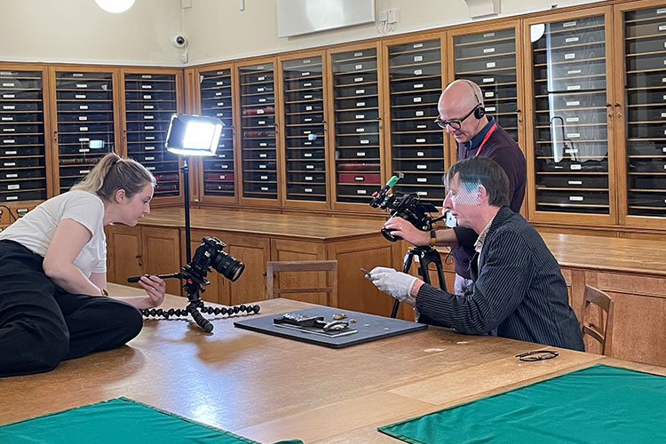 Ann Dinsdale, Principal Curator of the Brontё Parsonage Museum, being filmed with the Brontё’s miniature hand-stitched books.