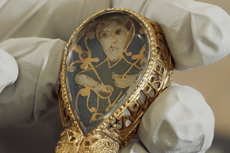 The documentary examines one of the Ashmolean’s earliest objects: a large carved ivory bead from the early 16th century, thought to have hung at the end of a rosary used in a monastery or cathedral. Carved into a double-sided head, one side depicts a skull, and the other shows a horrifying process of decay, covered in writhing worms, toads, and snakes. This brutal imagery, Matthew explains, was a direct link to the medieval world’s understanding of “dust to dust,” an age before refrigeration and when people frequently saw dead bodies and charnel houses where bones were stacked.