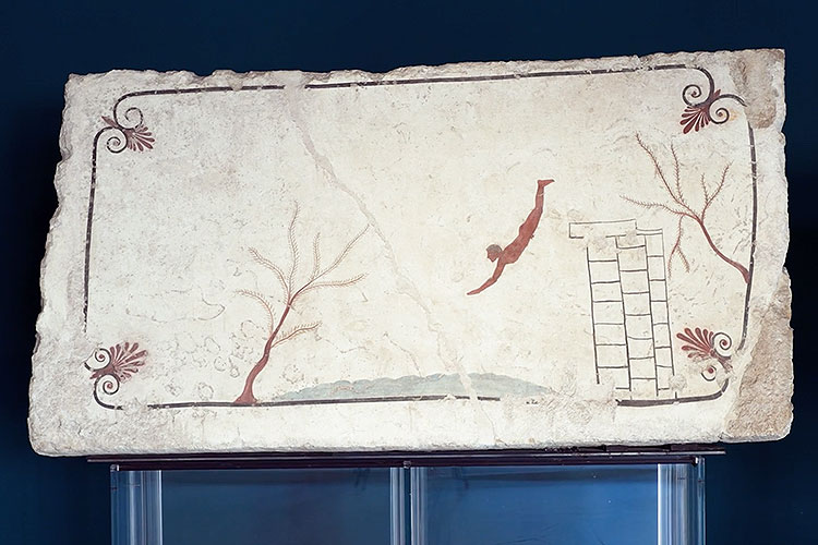 The artistic legacy of Greek Paestum is revealed in one of its greatest treasures: the Tomb of the Diver. Discovered in 1968, this is one of the only surviving examples of a complete Greek wall painting from the early 5th century BC anywhere in the world.
