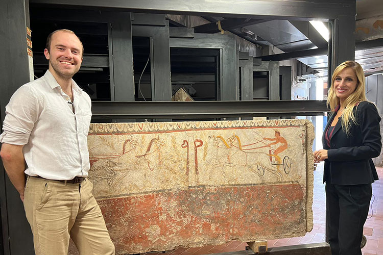 Tristan and Dr Tiziana D’Angelo stand beside a Lucanian artwork depicting chariot racing.