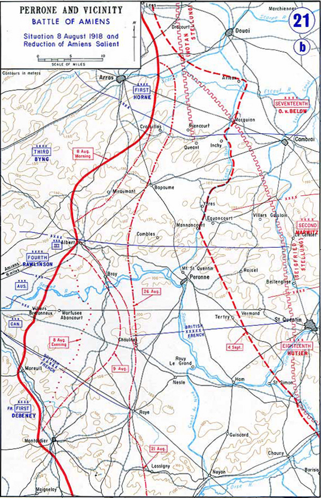 It began on 8 August with a short bombardment followed by a methodical advance along a 15-mile (24-kilometre) front. More than 400 tanks led the way for 11 divisions, which included the Australian and Canadian Corps. Support was also offered by the left wing of General Eugène Debeney’s French First Army.