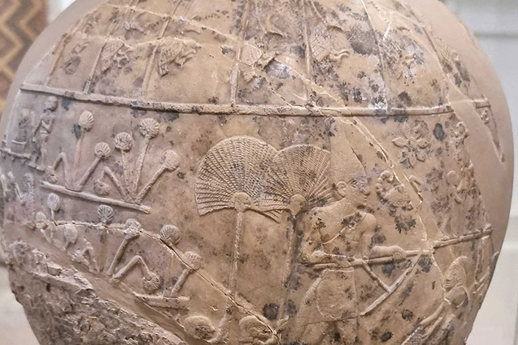 Close-up of King Scorpion’s macehead, showing the image of him in a similar way to the Pharaohs, and with hanging birds visible near the top, denoting ‘subject people’.
