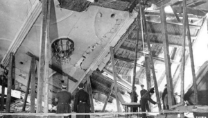 Exterior of the Führerbunker shortly before its destruction. Hermann Karnau recalled that Hitler & Eva Braun’s remains were burnt outside the emergency exit at the left. Credit: Bundesarchiv / Commons.