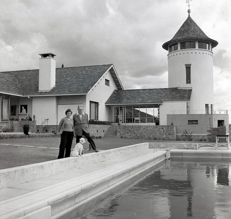 Stephen and Virginia Courtauld outside their house in Rhodesia, La Rochelle.
