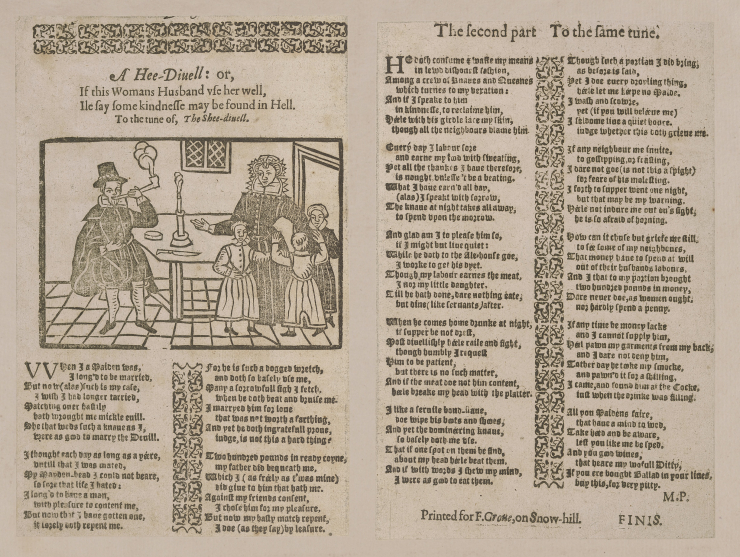 While brave men of history were praised in balladry, the reality of 17th century life for women was also revealed. In ‘A He-Devil’, a miserable wife laments her suffering at the hands of her drunkard husband, who spends her money and beats her.