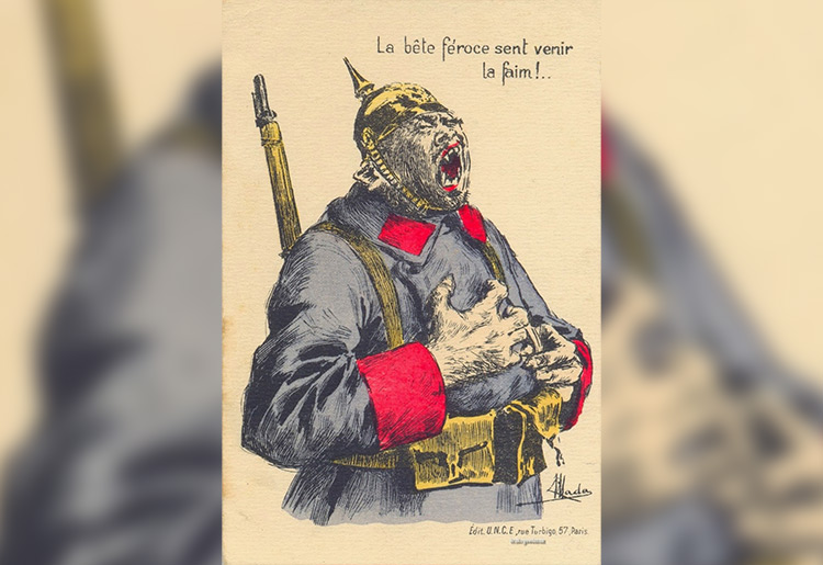 Another example of French propaganda characterising the Germans as beast-like and ravenous. The text means, ‘The beast is hungry!”. This design from 1915 became a popular French postcard – a cheap mode of communication that grew popular during World War One, and that would have circulated images and ideas quickly.