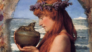 The central figure of Botticelli’s composition, set slightly back, is Venus, the Roman goddess who is variously associated with love, beauty, desire, sex, fertility, prosperity and victory. She is emphasised as the focal point of this composition by the arched frame created by branches and foliage, a halo effect comparable to the architectural shape of an apse, which would have surrounded depictions of the Virgin Mary. Above Venus, her son, Cupid, flies blindfolded, aiming his bow towards the next group of figures.