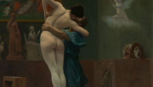 Venus gazes at her reflection in the mirror held up by Cupid. Its pink ribbons (used to hang the mirror on the wall) are knotted at the top and cross over his wrist, perhaps alluding to one of his attributes, the blindfold, or the shackles he used to bind the hearts of lovers. Parts of Cupid’s body – especially his far leg and face – are very loosely painted, appearing almost unfinished, forcing the viewer to focus in on the main subject, Venus.