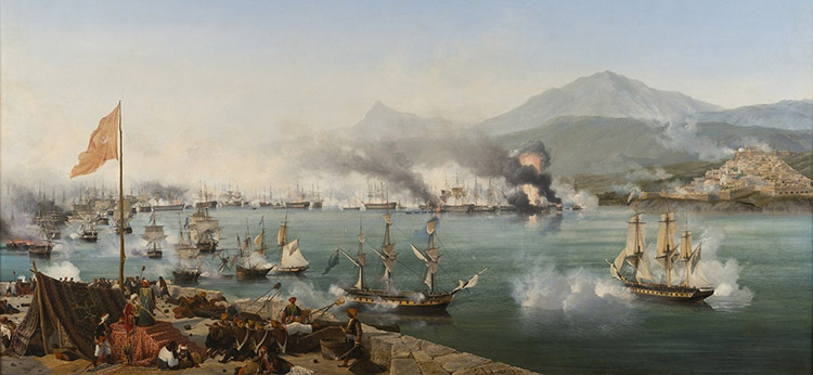 On 20 October 1827 a combined fleet of British, French and Russian vessels destroyed the Ottoman fleet at anchor in Navarino bay in Greece. The battle is notable for being the last major engagement involving only wooden sailing ships, and also a decisive step in the journey towards Greek and eastern European independence.