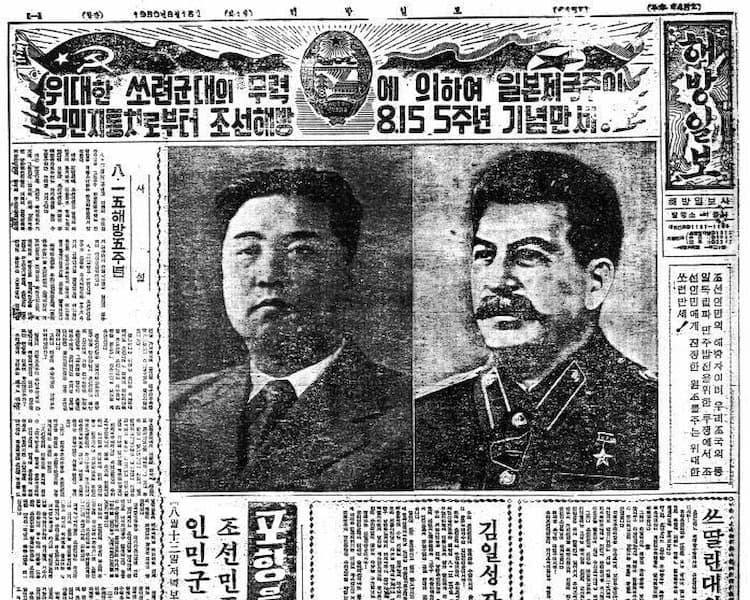 Kim Il-sung and Stalin on the front of Rodong Shinmun, a North Korean newspaper, in 1950.