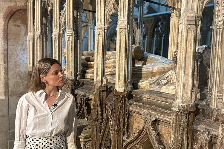 Dr Helen Carr at Edward II’s tomb at Gloucester Cathedral