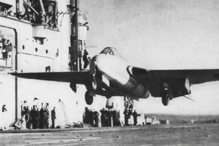 On 3 December 1945, Brown became the first pilot to land on and take off (pictured) from an aircraft carrier in a jet aircraft, when he flew a de Havilland Sea Vampire to HMS Ocean.