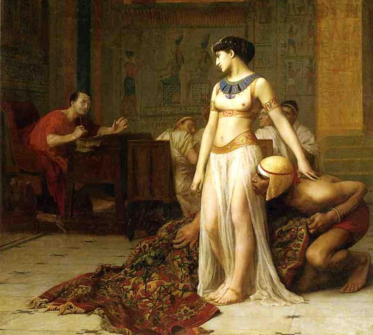 Cleopatra persuaded her servant to wrap her in a carpet and present her to the Roman general. In her best finery, she begged Caesar for his help to regain the throne.